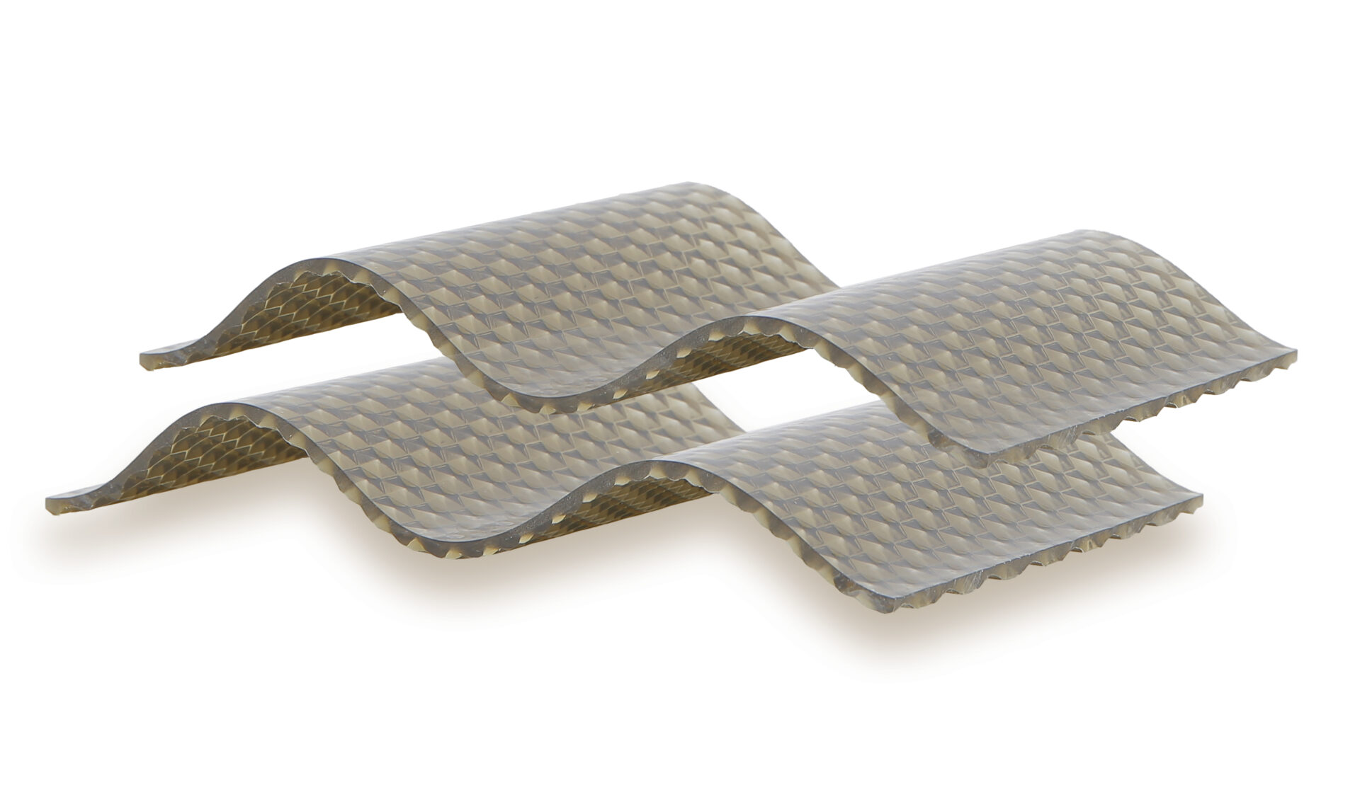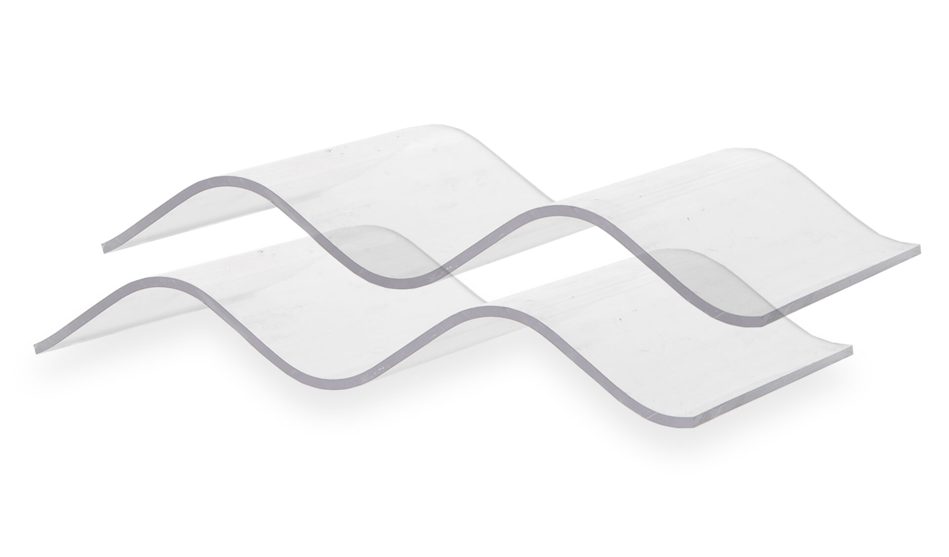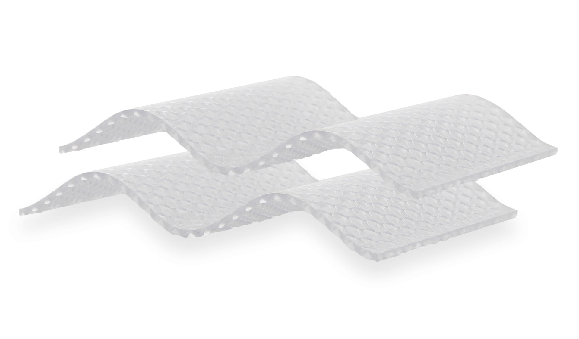 Wir bringen ein neues Produkt auf den Markt: eine transparente, mehrschichtige Polycarbonatplatte mit weißen, diagonalen Paneelen, die Schatten erzeugen, aber gleichzeitig auch Licht darunter.